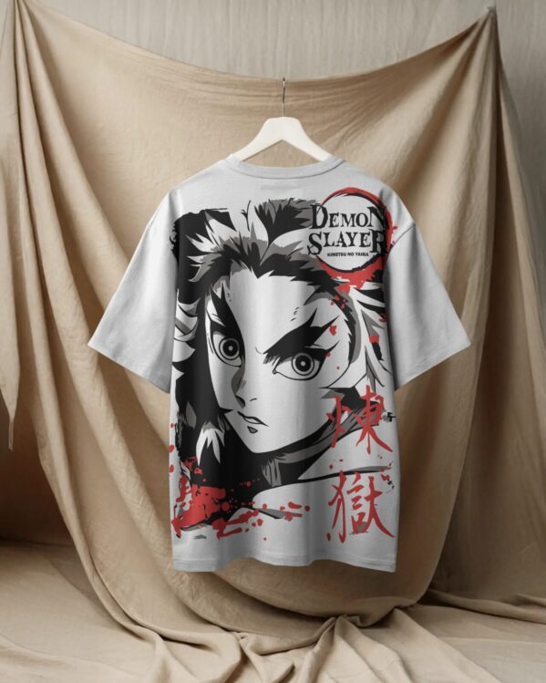 Con un imponente retrato de Kyojuro Rengoku, el Pilar de la Llama, en un diseño artístico en blanco, negro y detalles en rojo, esta camiseta ofrece un estilo poderoso y lleno de carácter.