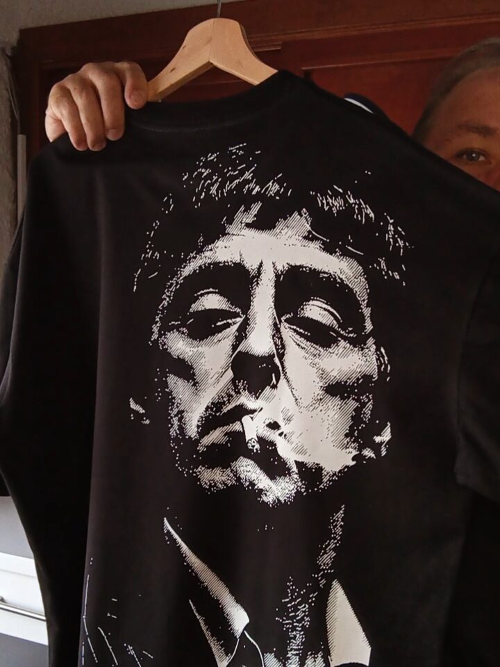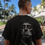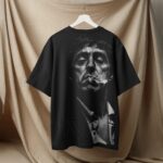 Diseñada en color negro con un impactante retrato en blanco y sombras intensas, esta camiseta captura toda la esencia icónica del cine gangster y la cultura urbana.