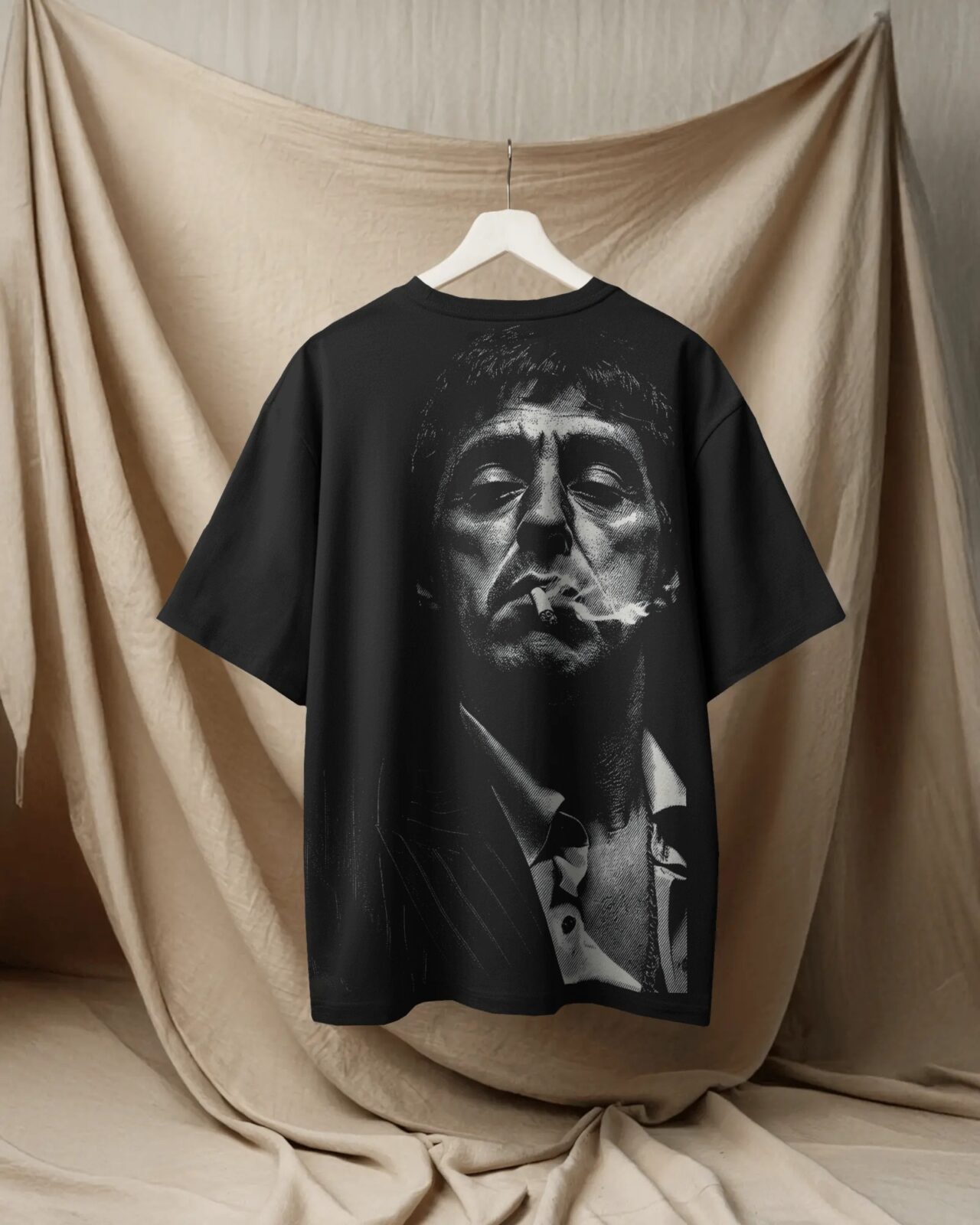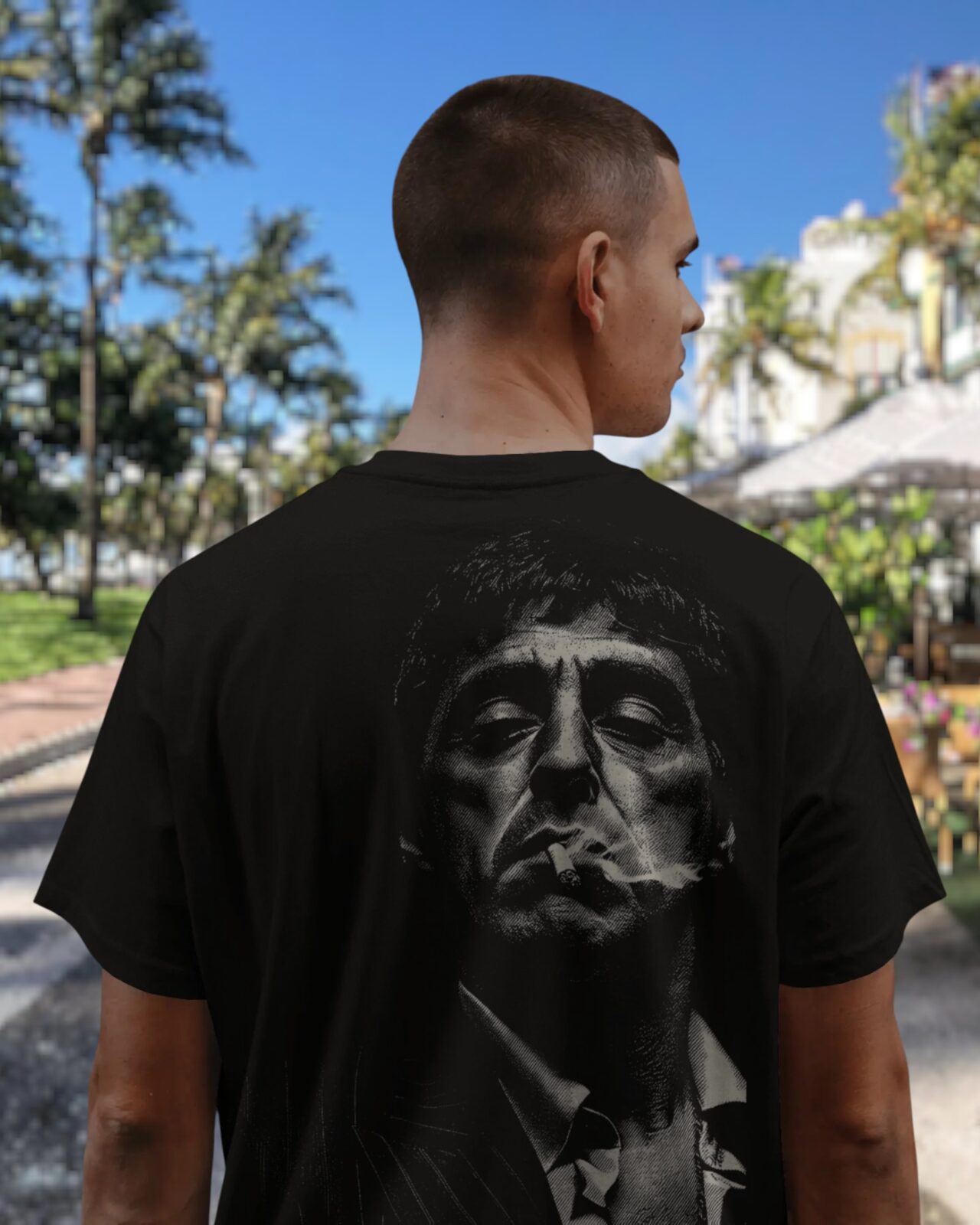 Potencia tu outfit urbano con esta camiseta inspirada en Tony Montana, el legendario protagonista de Scarface.